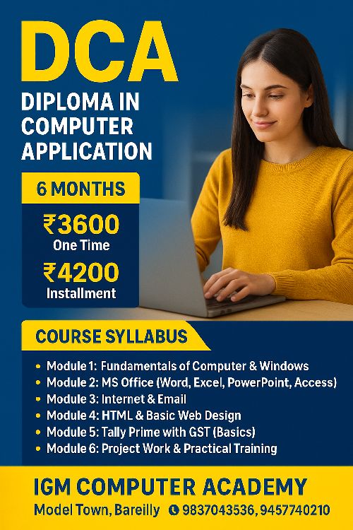 The DCA course is designed to provide students with a strong foundation in computer applications. It covers essential topics such as MS Office (Word, Excel, PowerPoint), Internet & Email, Basics of Hardware & Software, Windows Operating System, and Computer Fundamentals. This course is ideal for students, professionals, and anyone looking to enhance their computer skills for academic, personal, or career growth.