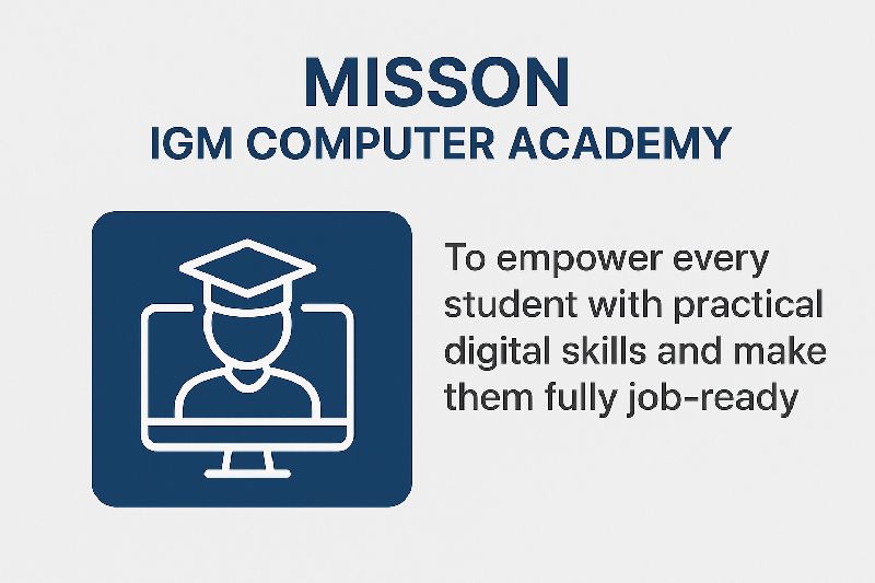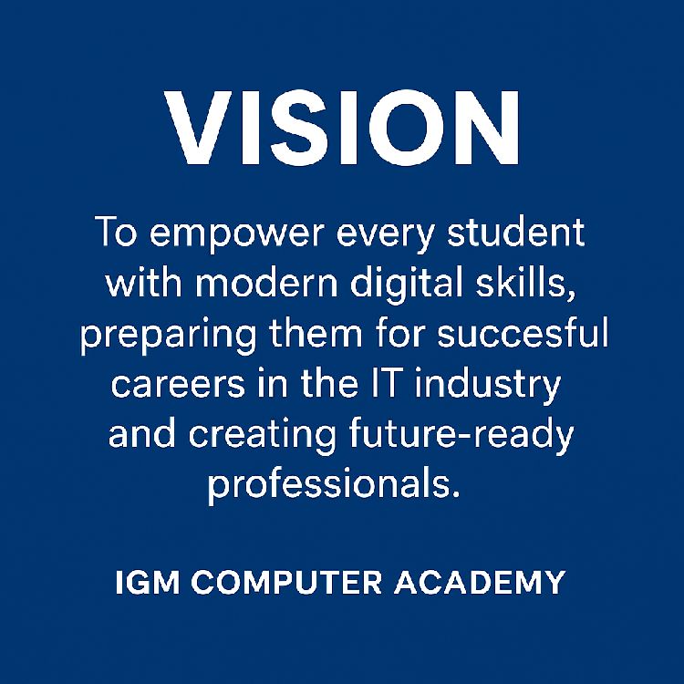 At IGM Computer Academy, our vision is to become the most trusted and leading center for computer education by providing high-quality, industry-oriented training to students from all backgrounds. We aim to bridge the gap between education and employability by equipping learners with practical skills, hands-on experience, and updated knowledge that matches current industry standards.