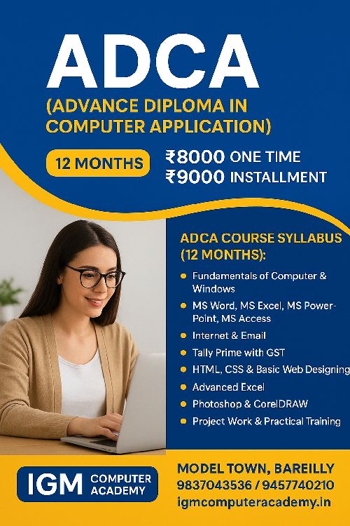 The ADCA course is an advanced computer program designed for students who want to enhance their computer skills beyond the basics. It covers MS Office (Word, Excel, PowerPoint, Access), Internet & Email, Tally, Basic Programming, Multimedia, and Networking Fundamentals. ADCA is ideal for students, job seekers, and professionals aiming for better career opportunities in IT and office environments.