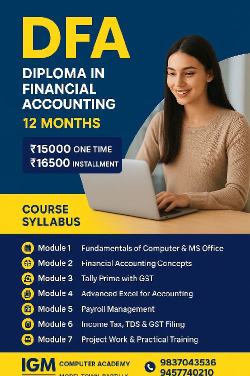 The Diploma in Financial Accounting (DFA) at IGM Computer Academy is designed to provide students with practical knowledge of accounting and finance using modern software. This course is ideal for those who want to pursue a career in accounting, finance, or taxation.