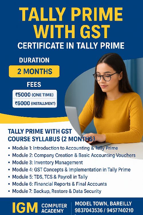 Tally Prime with GST is a comprehensive course designed to make you job-ready in accounting and taxation. Learn to manage accounts, billing, inventory, and GST compliance using the latest Tally Prime software. Course Highlights: Master Tally Prime for accounting and financial management Learn GST setup, invoicing, and tax returns Practical hands-on training with real-world examples Inventory management, payroll, and reporting in Tally Suitable for students, professionals, and business owners Outcome: After completing this course, you will be confident to work in accounting firms, businesses, or as a freelance accountant, fully skilled in Tally Prime with GST.