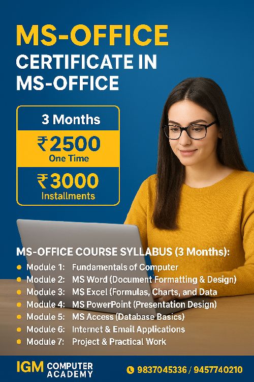 Our MS Office Courses are designed to make you proficient in all essential Microsoft Office applications, including Word, Excel, PowerPoint, and Access. This course helps you: Create professional documents and reports using Word Manage data efficiently with Excel, including formulas, charts, and tables Design impactful presentations with PowerPoint Learn database management with Access Gain practical skills through real-time projects and exercises Become job-ready for office and corporate environments Duration: 1–3 months (flexible batches) Who can join: Students, professionals, and anyone looking to improve computer skills