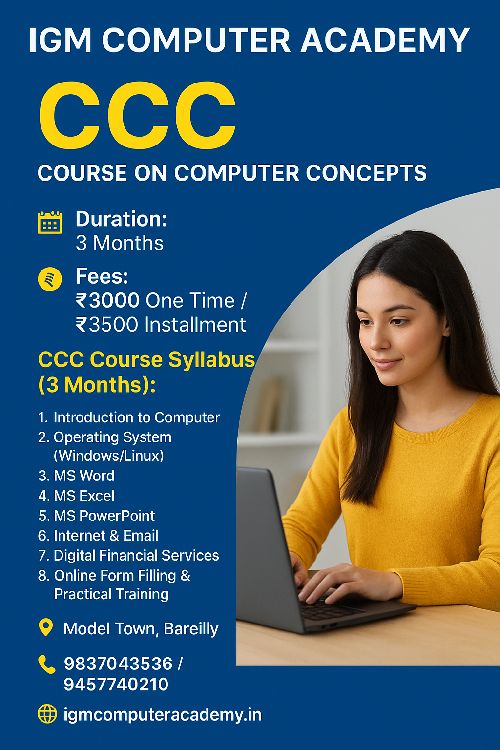 The CCC Course is a basic computer literacy program designed for beginners. This course helps students learn essential computer skills required for daily use, government jobs, office work, and digital platforms. Students gain knowledge of operating computers, typing, internet usage, email, MS Office, digital payments, and online services. It is perfect for students, job seekers, and anyone who wants to improve digital skills. Key Highlights: Basic computer operations Internet browsing & online services MS Word, Excel, PowerPoint basics Email creation & usage Digital payments (UPI, wallets, online banking) Government exam–friendly syllabus
