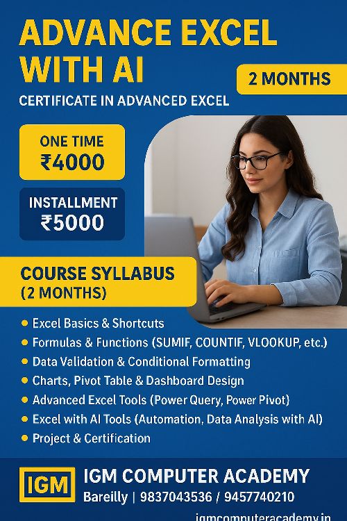 The Advanced Excel Course at IGM Computer Academy is designed for students, professionals, and job seekers who want to master Excel for real-world work. In this course, you will learn advanced formulas, data cleaning techniques, data analysis tools, pivot tables, VLOOKUP, HLOOKUP, XLOOKUP, IF conditions, charts, dashboards, and automation using advanced features. This course will help you perform office tasks faster, analyze business data, create reports, and present information professionally. After completing this course, you will be fully prepared for office jobs, accounting work, data management, and MIS reporting.