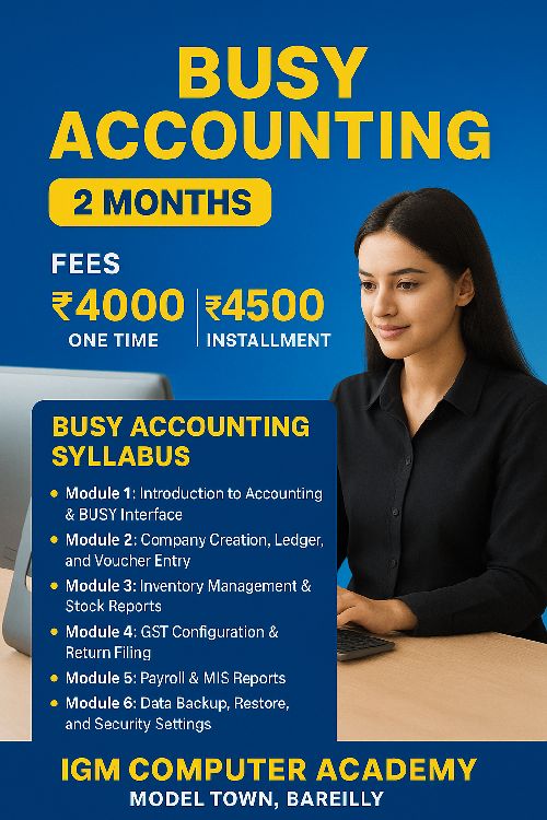 BUSY Accounting Software is a powerful business management and accounting tool used by small, medium, and large enterprises. It helps businesses manage accounts, inventory, billing, GST, and financial reports efficiently. In this course, students learn how to handle real-life business transactions using BUSY, making them job-ready for accounting roles. Key Features Covered: Complete Accounting Management GST Billing & Return Filing Inventory & Stock Management Financial Statements (P&L, Balance Sheet) Voucher Entry & Ledger Creation Sale, Purchase & Taxation Reports Multi-Company & Multi-User Handling Who Can Join: Students, job seekers, shopkeepers, small business owners, and accounting professionals who want hands-on training in BUSY.
